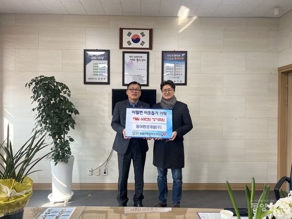 진천 동아환경개발㈜(대표 고윤기)는 26일 이월면 행정복지센터를 방문해 지역 내 어려운 이웃을 위해 써달라며 매월 60만원의 정기 후원금을 전달했다. / 진천군