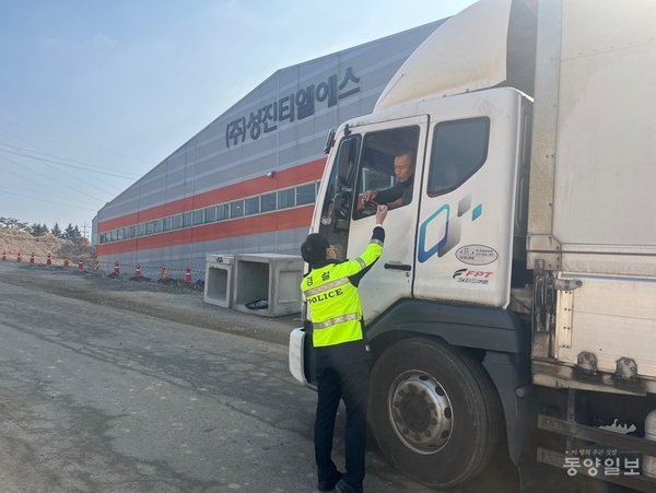 진천경찰서(서장 조성수)는 26일 이월면 소재 물류회사에서 화물차 안전운행과 교통사고 예방을 위한 교통안전 캠페인을 실시했다. / 진천경찰서