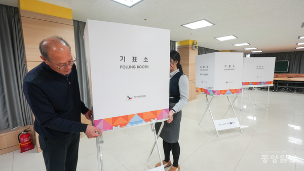 1회 ’전국동시 새마을금고이사장 선거를 하루 앞둔 4일 청주시 청원구 내덕동 내율사새마을금고본점(6층)에 마련된 투표소에서 선거관리위원회 관계자들이 투표소 설치로 분주하다. 손상훈 기자 mjsh9370@dynews.co.kr