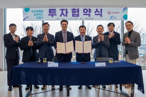 증평군은 5일 김득신문학관에서 충북도와 ㈜신라명과와 제빵공장 신설을 위해 500억원을 투입하는 투자협약(MOU)을 체결했다. / 증평군