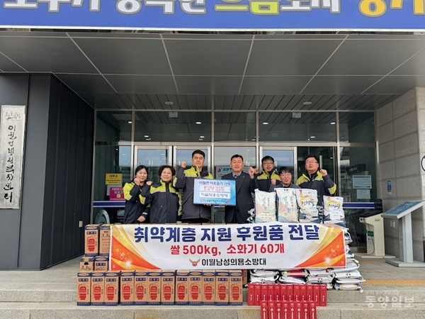 이월면 의용소방대(대장 김세환)는 5일 이월면 행정복지센터를 방문해 지역 내 소외계층을 위한 백미(10㎏) 48포와 일반소화기 60개를 기부했다. / 진천군