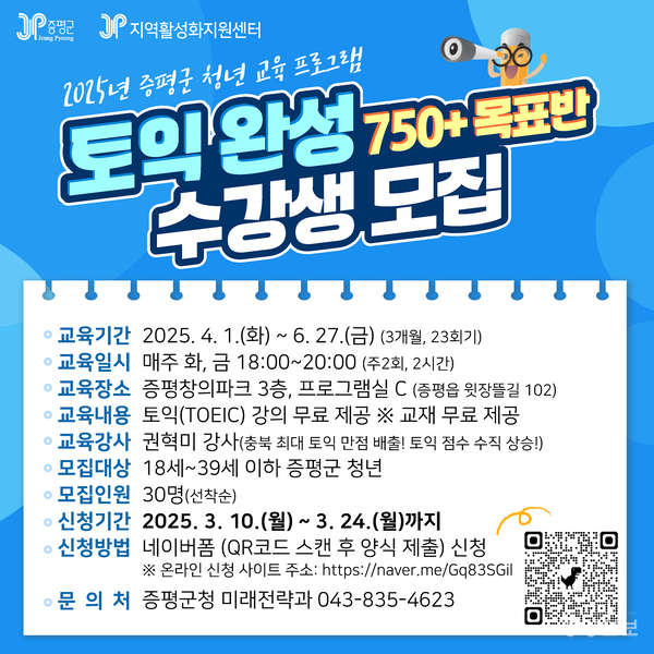 증평군이 청년 교육 프로그램 ‘토익 완성 750+ 목표반’ 수강생 30명을 선착순 모집한다.