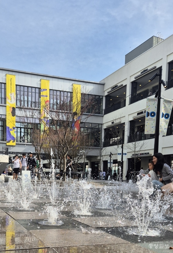 대전 지역 낮 기온이 26도 이상으로 상승한 23일 오후 대전 유성구 현대프리미엄아울렛 대전점 광장에 설치된 분수가 시원한 물줄기를 뿜어내고 있다. 정래수 기자 raesu1971@dynews.co.kr