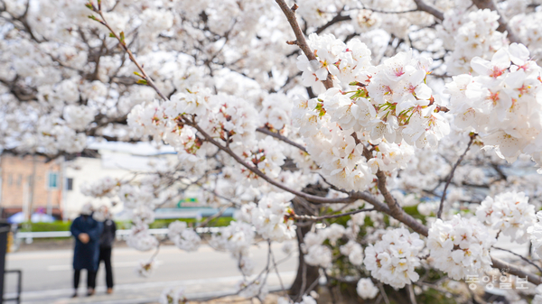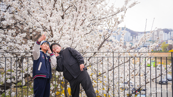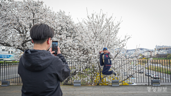 봄바람이 시원하게 부는 30일 청주시 상당구 무심천변에 벚꽃이 활짝 펴 시민들이 사진촬영을 하고 있다. 손상훈 기자 mjsh9370@dynews.co.kr