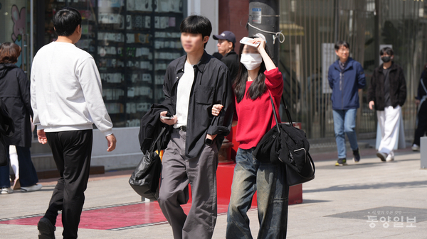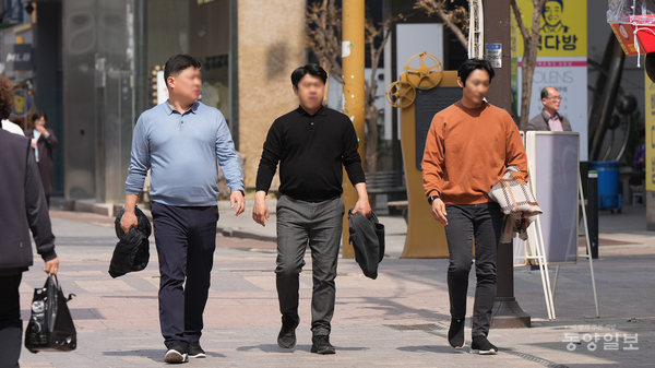 최근 꽃샘추위가 기승을 부리면서 두꺼운 외투를 챙겼던 시민들이 31일 낮 기온이 최고 15도까지 오르자 외투를 벗어들고 거리를 걷고 있다. 반팔이 등장하는가 하면 팔소매를 걷어 올리는 때 이른 여름 풍경을 자아냈다. 손상훈 기자 mjsh9370@dynews.co.kr