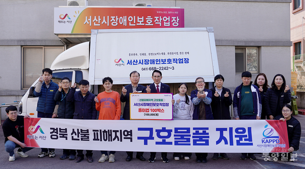 시는 1일 서산시장애인보호작업장에서 산불 피해 이재민을 위해 150만 원 상당의 종이컵 10만 개를 기탁했다고 밝혔다.