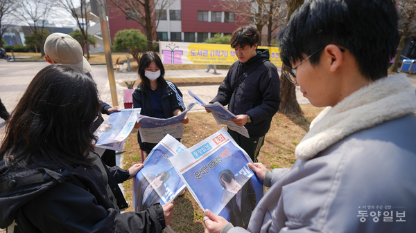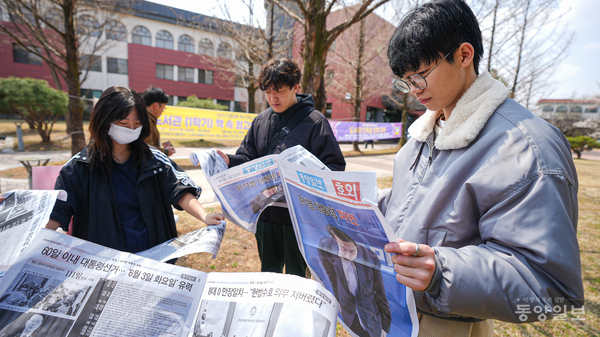 헌법재판소가 대통령 탄핵인용(파면)을 결정한 지난 4일 청주시 흥덕구 강내면 충청대학교에서 학생들이 동양일보가 발행한 호외를 보고 있다. 손상훈 기자 mjsh9370@dynews.co.kr