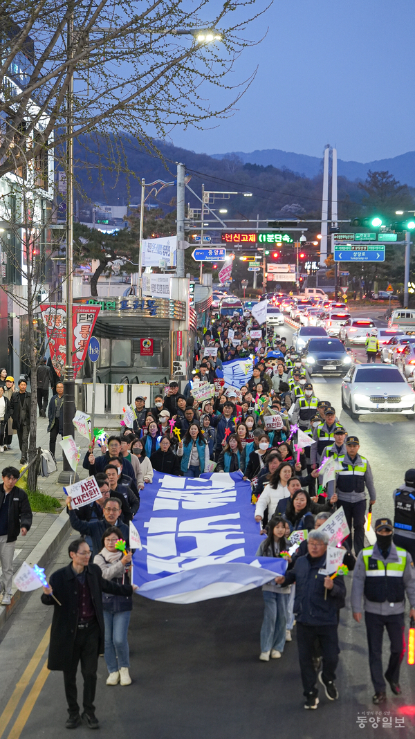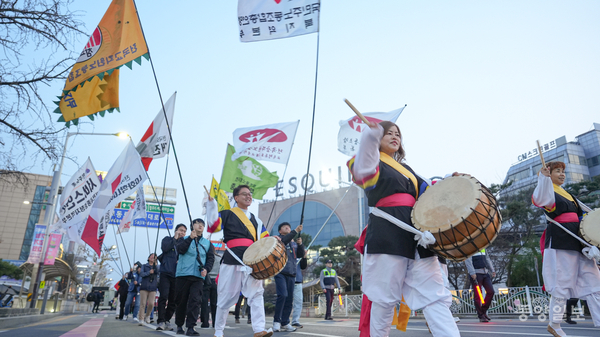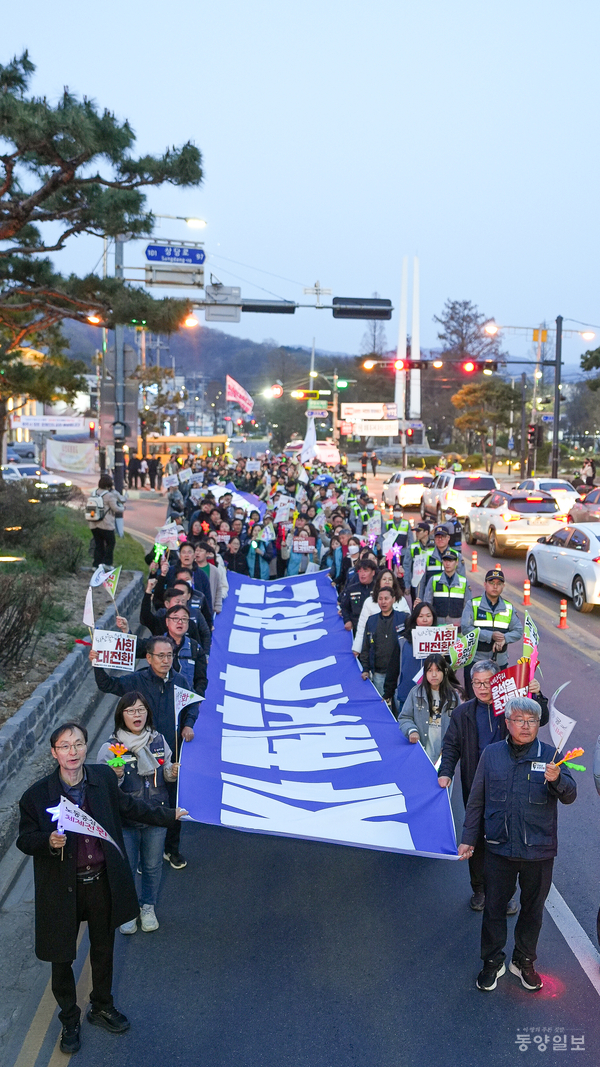 헌법재판소가 윤석열 전 대통령의 탄핵 인용을 결정한 지난 4일 오후 충북비상시국회의는 충북도청 앞에서 집회를 연 뒤 홈플러스 청주 성안점까지 행진을 진행했다. 이날 집회에는 200여 명이 참여했다. 손상훈 기자 mjsh9370@dynews.co.kr