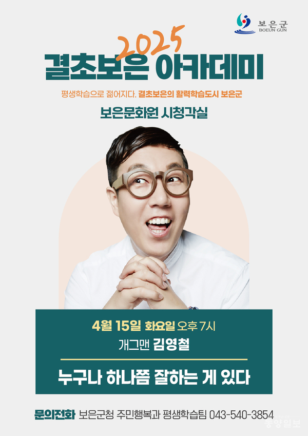 보은군은 유명 방송인 김영철씨를 초청해 ‘누구나 하나쯤 잘하는 게 있다’라는 주제로 오는 15일 저녁 7시 보은문화원 시청각실에서 2025년 결초보은 아카데미의 첫 강연을 한다.
