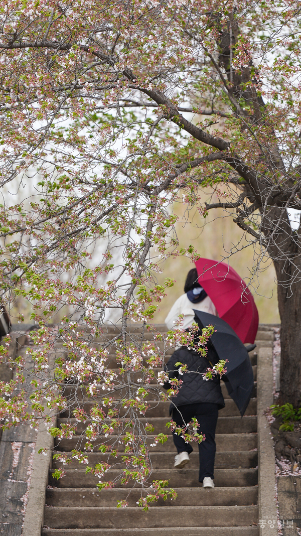 강풍주의보가 내려진 13일 청주시 상당구 무심천 길에서 시민들이 강한 바람에 떨어지는 벚꽃잎을 보며 아쉬워하고 있다. 이날 충북 전역과 대전, 세종, 충남 일부 지역에서 강풍주의보가 발효돼 바람이 순간풍속 70km/h(20m/s) 이상으로 매우 강하게 불었다. 손상훈 기자 mjsh9370@dynews.co.kr