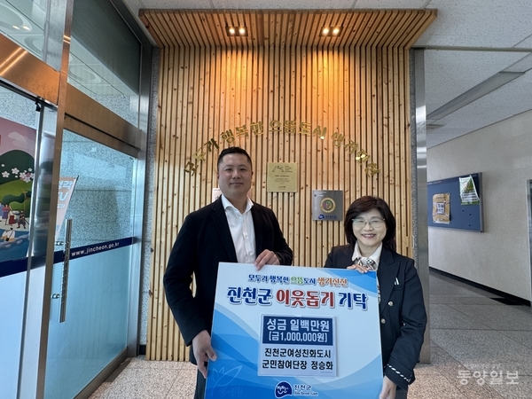 진천군 여성친화도시 군민참여단(단장 정승화.좌측)은 16일 군을 방문해 디딤씨앗통장 가입 아동을 위한 성금 100만원을 전달했다. 진천군