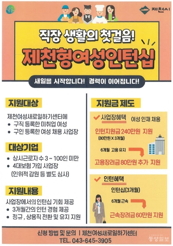 시 관계자는 “이 사업을 통해 제천에 거주하는 경력단절 여성이 직장에 적응할 수 있도록 실무경험을 제공하고 취업 후 고용이 유지될 수 있도록 지원해 구직자와 기업 모두에게 실질적인 도움이 될 것으로 기대하고 있다”고 말했다.