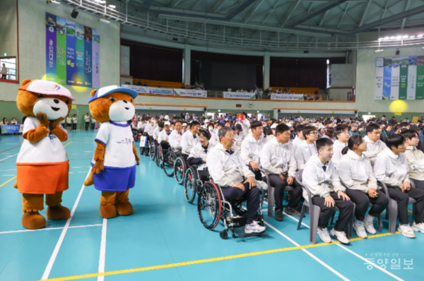 이날 오전 열린 개막식은 장애인댄스팀 '해피플로우'와 곽지은의 식전 공연에 이어 각 시·군 선수단 입장, 대회기 게양, 내빈 환영사·축사, 선수·심판 대표 선서 순으로 진행됐다.