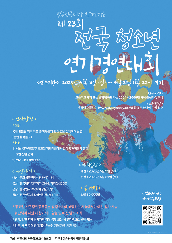 예선전 참가 신청은 지난 13~21일 유웨이 어플라이에서 온라인으로 접수를 받았으며, 예선 통과자는 5월 31일(토) 한국예술종합학교에서 열리는 본선에 진출하게 된다. 본선 수상자에게는 문화체육관광부 장관상, 한국대학연극학과 교수협의회 회장상, 한국연극교육학회 회장상, 젊은연극제 집행위원장상 등 다양한 상이 수여될 예정이다.