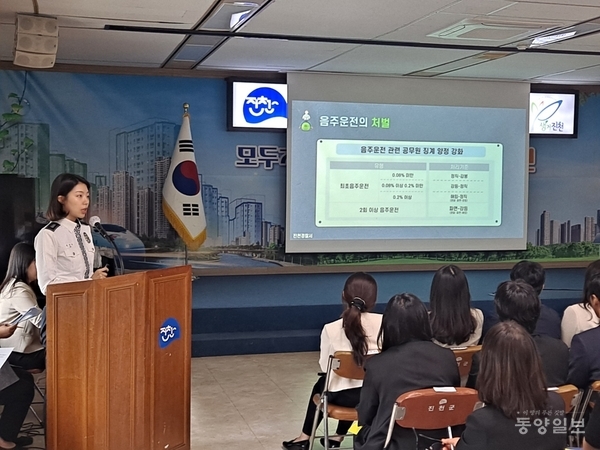 진천경찰서(서장 손휘택)는 1일 진천군청 대회의실에서 진천군청 소속 공무원 100여명을 대상으로 음주운전과 교통사고 예방에 대한 교통안전 교육을 실시했다. 진천경찰서