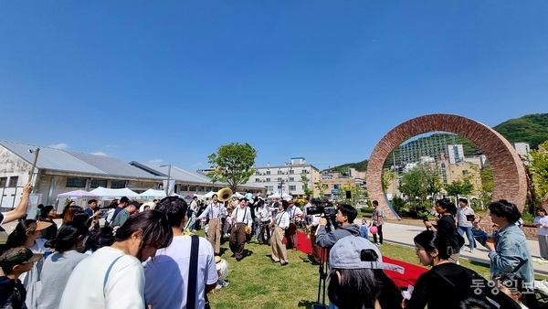 특히 이날 첫 공개한 조형물 ‘우리 하나되어’는 청주의 상징 우암산을 배경으로 동부창고의 정체성인 적벽돌 위로 떠오르는 태양을 상징하는 원형 조형을 올렸다.