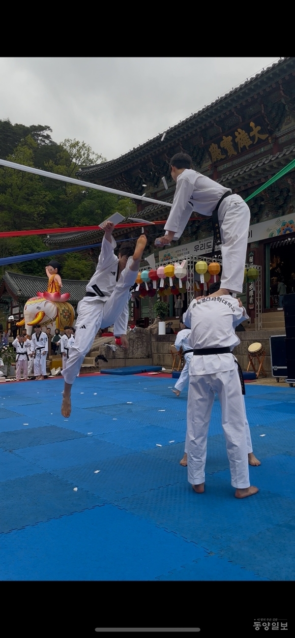충북보과대 태권도외교과가 지난 5일 부처님오신날을 맞아 속리산 법주사에서 태권도 시범공연을 진행했다.