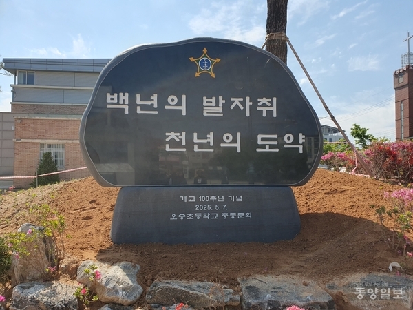 청주 오송초(교장 배광일)가 7일 개교 100주년을 맞아 교목 오엽송이 있는 일송관 앞 화단에 기념 표지석<사진>을 설치했다.