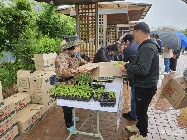 진천군 여성농민회(회장 이갑인)가 지난 9일 덕산읍 구말 문화센터 광장에서 고추와 동부, 옥수수, 오이, 땅콩, 참외, 호박, 흑수박 11종 8천500모를 배부하는 ‘토종농산물 모종 나눔 행사’를 가졌다. 진천군
