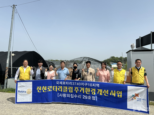 진천로타리클럽(회장 노재명)이 9일 진천읍에 거주하는 취약계층 다자녀 가구를 위한 ‘사랑의 집수리 29호점’ 현판식을 가졌다. 진천군