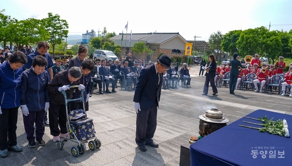 증평 출신의 호국영웅 고 연제근 상사를 기리는 추모식이 13일 도안면 화성리의 연제근 공원에서 열린가운데 유가족들이 참배를 드리고 있다. 증평군