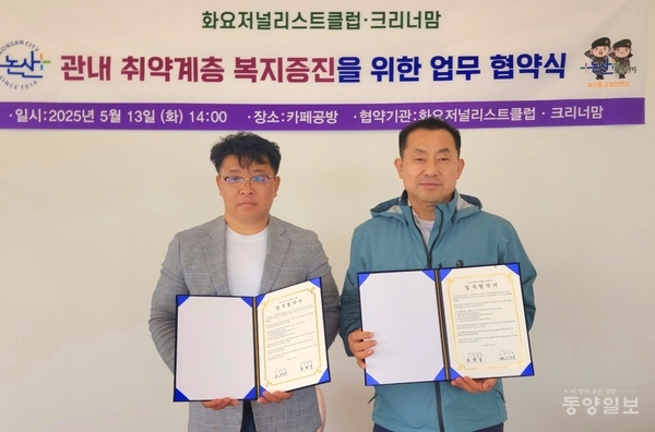 논산에서 활동 중인 주요 언론인 모임인 화요저널리스트클럽과 지역사회 복지기업 크리너맘이 13일 '지역사회 복지 증진을 위한 업무협약'을 했다.