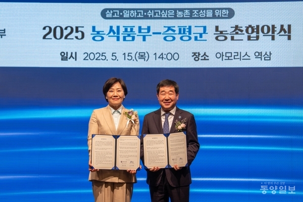 증평군은 15일 서울 아모리스 역삼에서 열린 ‘2025년 농촌협약식’에서 농림축산식품부와 농촌협약을 체결하고 다양한 생활서비스 전달체계를 구축한다. 송미령(좌) 농림부장관과 이재영 군수가 협약서를 들어보이고 있다. 증평군