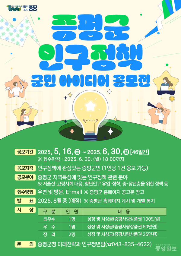 증평군이 인구감소 문제에 능동적으로 대응하고 지역 특성에 맞는 정책을 발굴하기 위해 인구정책 군민 아이디어 공모전을 개최한다.