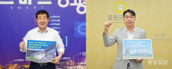 19일 이재영 증평군수와 조윤성 증평군의회 의장은 '청주공항 민간전용활주로 건설, 서명운동 동참'이라는 표어를 들고 릴레이 캠페인에 참여했다.