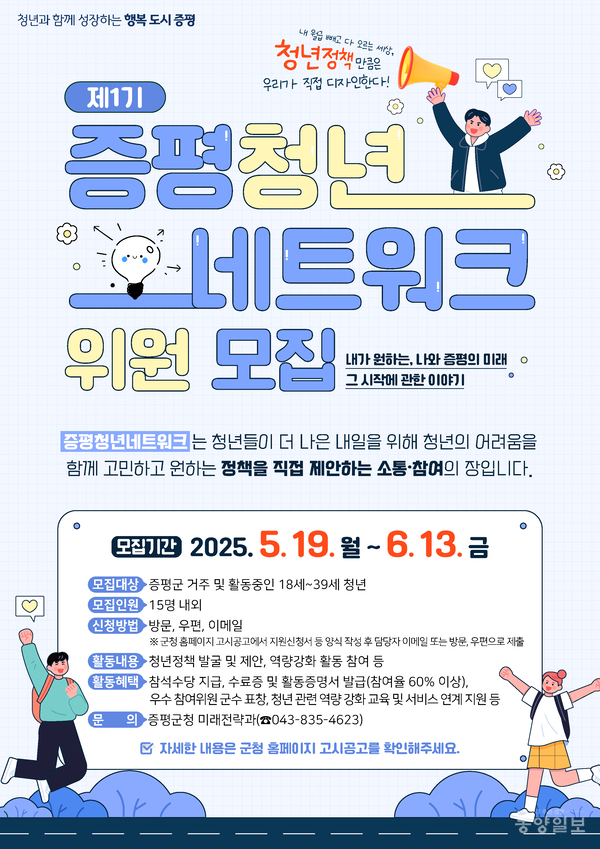 증평군이 지역 청년들의 군정 참여 기회 제공과 청년정책 발굴을 위한 1기 증평청년네트워크 위원을 모집한다.