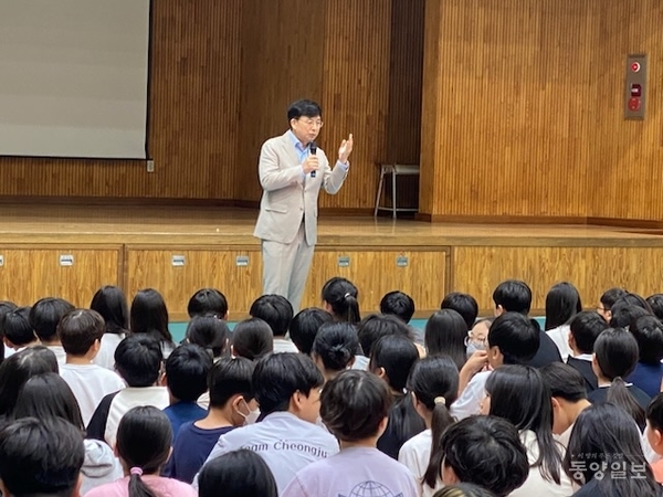 청주 산성초(교장 이정애)가 26일 6학년 전체 학생과 학부모를 대상으로 전 KBS PD이자 다큐멘터리 ‘울지마 톤즈’의 제작자인 구수환 PD를 초청해 특별강연을 진행했다.