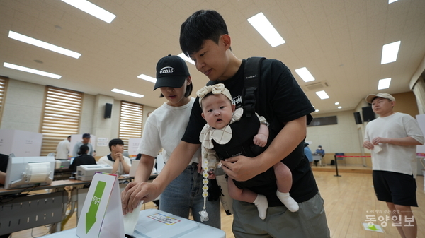 21대 대선 사전투표 첫날인 29일 청주시 율량사천 행정복지센터에 마련된 사전투표소에서 한 가족이 아이와 함께 소중한 한 표를 행사하고 있다. 손상훈 기자 mjsh9370@dynews.co.kr