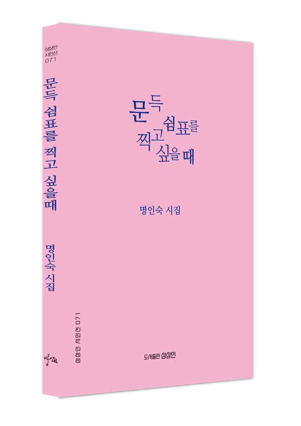 명인숙 시인의 시집 『문득 쉼표를 찍고 싶을 때』가 도서출판 상상인에서 출간됐다. 이 시집은 1부 달빛이 더 오래 비치는 곳에서 품는 바다, 2부 꿈꾸던 풍경에 들었다 나온 오후, 3부 어디쯤에서 파도가 불어올까요, 4부 오래도록 지워지지 않는 물밑의 말로 구성됐다.