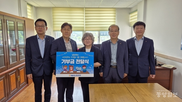 NH농협생명은 4일 증평 도안초를 찾아 200만 원의 발전기금을 기탁했다. 전달식에서는 연제문 증평농협 지부장, 김재복 NH농협금융 자산운용부분 CIO, 이정인 도안초 교장, 배종록 증평농협 조합장, 장준성 NH농협생명 충북총국장 등이 참석했다.(좌로부터) 괴산증평교육지원청