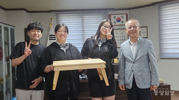 청주여상 목공 창업동아리 아랫목(木) 학생들이 9일 광복회 충북 청주시지회를 방문해 사랑의 목공품 나눔 봉사를 진행했다.