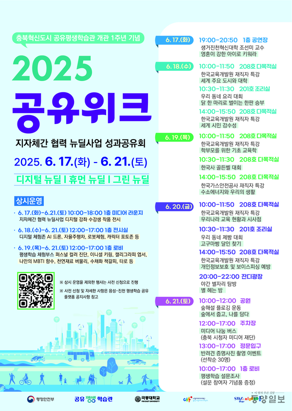 오는 17일~21일 충북혁신도시 복합혁신센터와 공유평생학습관 일원에서 열리는 ‘공유 위크(Share Week)’는 행정안전부 주관 ‘지자체 간 협력 뉴딜사업(2022~2025)’의 성과를 공유하고, 전국 최초 지자체 간 공동 운영 평생학습관인 공유평생학습관 개관 1주년을 기념하기 위해 음성군과 함께 준비했다.