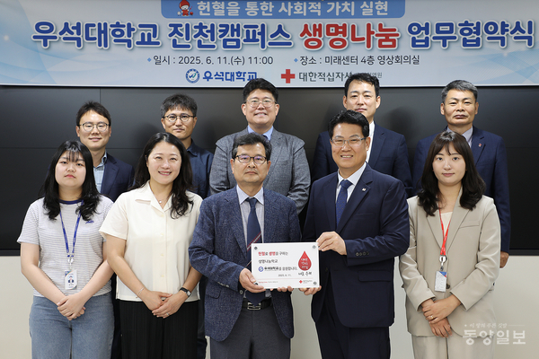 우석대 진천캠퍼스는 11일 대한적십자사 충북혈액원(원장 임군빈)과 미래센터 4층 영상회의실에서 생명 나눔 실천과 지역사회 협력을 위한 업무협약을 체결했다. 우석대