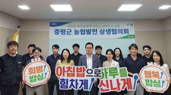 농협증평군지부(지부장 연제문)는 11일 군지부 회의실에서 16명의 임직원이 참여한 가운데 증평군 농협발전상생협의회를 출범하고 쌀소비촉진, 연체관리 등에 대한 토론을 벌였다. 농협증평군지부