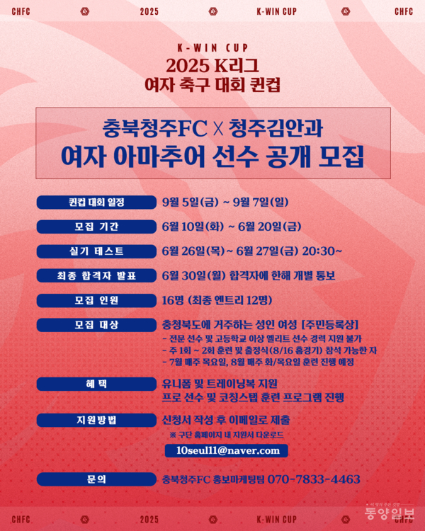 출전 선수 모집은 오는 20일까지이며 구단 홈페이지를 통해 신청하면 된다. 대상은 주민등록상 충북에 거주하는 여성이다.