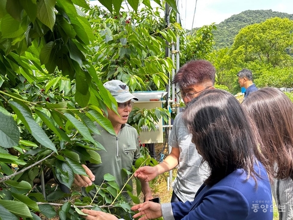 현장에서는 공무원, 체리 연구회원 등 10여명이 참석한 가운데 스마트 비가림 시설 조성 시범사업의 성과를 평가했다.