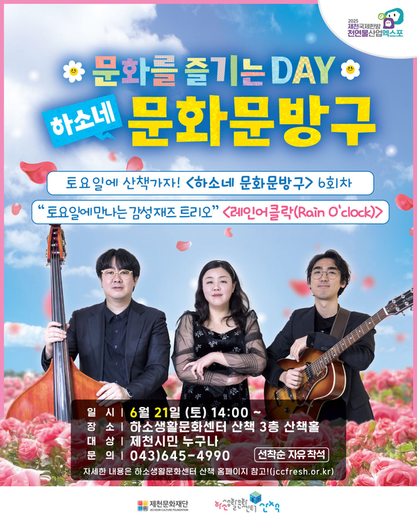 제천문화재단(이사장 김상수)은 오는 21일 오후 2시 하소생활문화센터 산책 산책홀에서 ‘하소네 문화문방구’ 6회차 ‘레인어클락(Rain O’clock)’공연을 한다.
