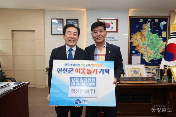 진천군 양산전설(주)(대표 윤형길)은 진천군청을 방문해 디딤씨앗통장 가입 아동 자립 지원을 위한 성금 1000만원을 전달했다. 진천군
