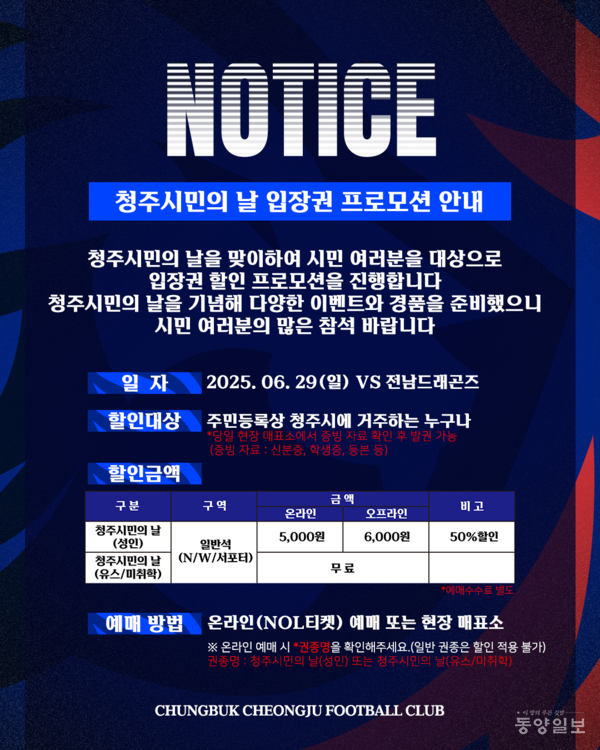 충북청주FC는 청주시민을 대상으로 일반 성인 입장권에 대해 예매가와 현장가 각각 50% 할인 혜택을 제공하며, 청소년과 미취학 아동에게는 무료 입장 기회도 마련할 예정이다.