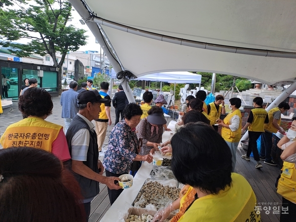 한국자유총연맹 진천군지회(회장 김윤호)는 25일 진천읍 행정복지센터 광장에서 찐감자와 쑥개떡, 주먹밥 등 200인분을 주민들에게 나눠주는 6.25 당시 음식재현, 무료시식 행사를 가졌다. 진천군