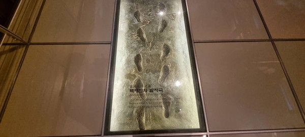 이곳에서는 사비 도성 주변으로 백제 관련 유적이 만들어지는 과정을 디오라마 형식으로 보여주고 있었다. 성문 앞에 서니 타임머신을 타고 백제에 와 있는듯한 착각이 들 정도다. 크기가 실제 인간의 모습과 유사해 놀라울 정도로 사실적으로 다가왔다. 1995년 부여 궁남지 목조 집수시설 유적에서 발견된 백제인의 발자국(길이 약 20cm, 너비 10cm 정도)도 눈에 띈다.