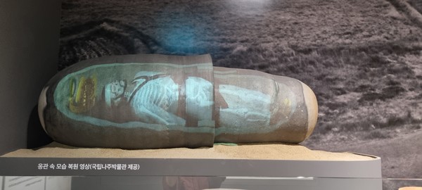 1전시실 백제로를 따라가니 백제의 탄생부터 멸망까지의 역사를 담은 영상이 재생되고 있었다. 전시된 토기를 통해 백제인들의 생활양식을 상상할 수 있었는데 특히 옹관묘에 그래픽을 사용해 시신을 재현해 놓은 점은 압권이었다. 건설 영상이나 시청각 자료들이 곳곳에 있어서 백제의 역사와 문화를 쉽게 이해할 수 있는 점이 흥미로웠다.