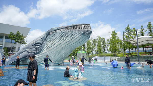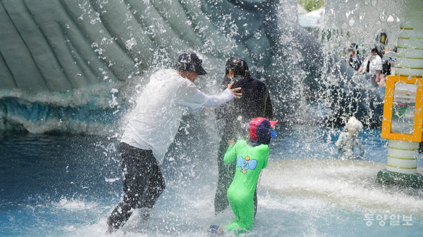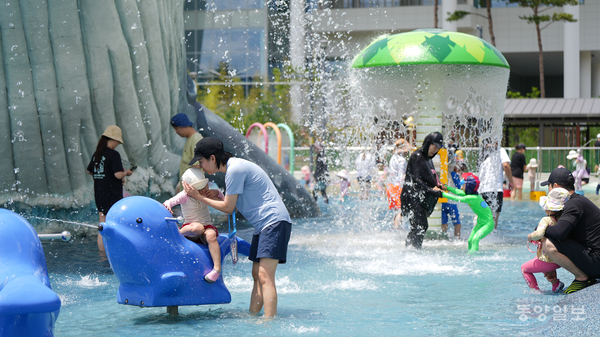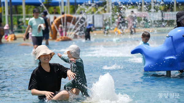최고기온 33도까지 오른 29일 청주시 청원구 주중동 생명누리공원에서 시민들이 물놀이로 더위를 식히고 있다. 생명누리공원 물놀이터는 오는 8월 24일까지 무료로 운영된다.