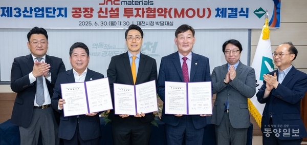 제천시는 30일 제천시청에서 EV전지용 방열제품, 배터리 제조 기업인 ㈜제이앤씨머트리얼즈(대표 이창근)와 제천 3산업단지 공장 신설 투자협약을 했다.