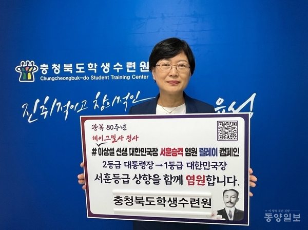 최영미 학생수련원장이 9일 이상설 선생의 대한민국장 서훈 승격을 염원하는 릴레이 캠페인에 동참했다.<사진>