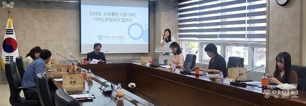충주교육지원청(교육장 이정훈)이 유보통합 시행을 앞두고 9일 지역실무협의체 협의회를 열었다.<사진>